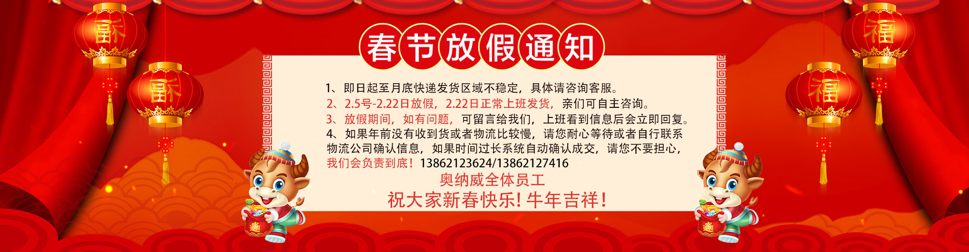 尊敬的客戶,您好,結(jié)合疫情進(jìn)展情況以及本公司的政策,現(xiàn)將本公司2021年年假及春節(jié)放假安排:2021年2月5日---2021年2月19日(正月初八),放假期間安裝及售后暫停服務(wù),業(yè)務(wù)咨詢正常溝通,感謝新老客戶在2020年對本公司的信任和大力支持,2021年將更加努力把最優(yōu)質(zhì)的服務(wù)給到到客戶,放假期間聯(lián)系電話:13862123624,在此奧納威全體員工提前祝各位老板春節(jié)快樂,財源廣進(jìn)!